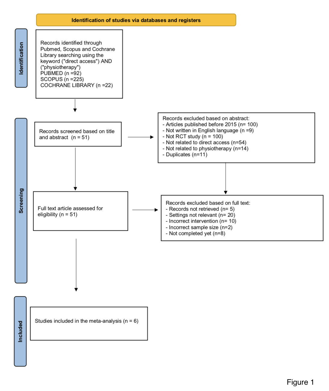 The electronic databases PubMed, Scopus, Cochrane Library were investigated, using the following keywords, which were combined to achieve maximum search strategy sensitivity: “direct access” AND “physiotherapy”. First, articles were screened by title and abstract, using the following inclusion criteria for selection: (1) randomized controlled trials (RCTs); (2) written in English language; (3) published on indexed journals from 2015 to 2025. The exclusion criteria were: (1) non-randomized trials; (2) reviews; (3) papers written in other languages than English. Second, the full texts of the selected articles were screened with further exclusions according to the previously described criteria. A PRISMA flowchart of the selection and screening method is provided in Figure 1.