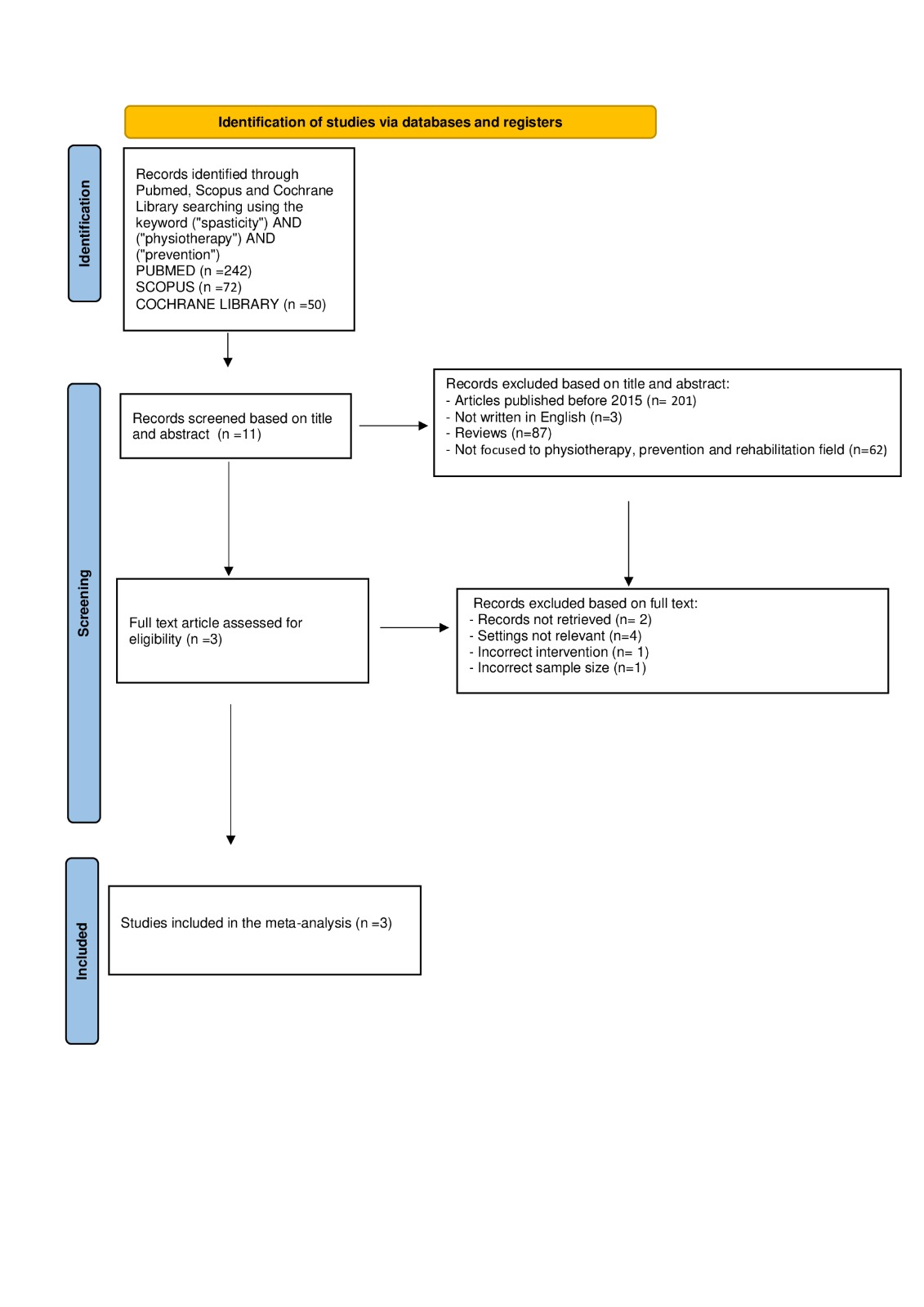 Authors searched English articles published from 2015 to 2025 according to the Preferred Reporting Items for Systematic Reviews and Meta-Analyses (PRISMA) principles. The electronic databases PubMed, Scopus, Cochrane Library were investigated, using the following key words, which were combined to achieve maximum search strategy sensitivity: (“spasticity”) AND (“physiotherapy”) AND (“prevention”). First, articles were screened by title and abstract, using the following inclusion criteria for selection: (1) written in English; (2) published on indexed journals; and (3) dealing with the importance of spasticity prevention in a physiotherapy field . The exclusion criteria were  (1) published before 2015; (2) reviews; (3) papers written in other languages than English; and (4) data not strictly related to spasticity and not focused on physiotherapy, prevention and rehabilitation field. Secondly, the full texts of the selected articles were screened with further exclusions according to the previously described criteria. A PRISMA flowchart of the selection and screening method is provided in Figure 1.