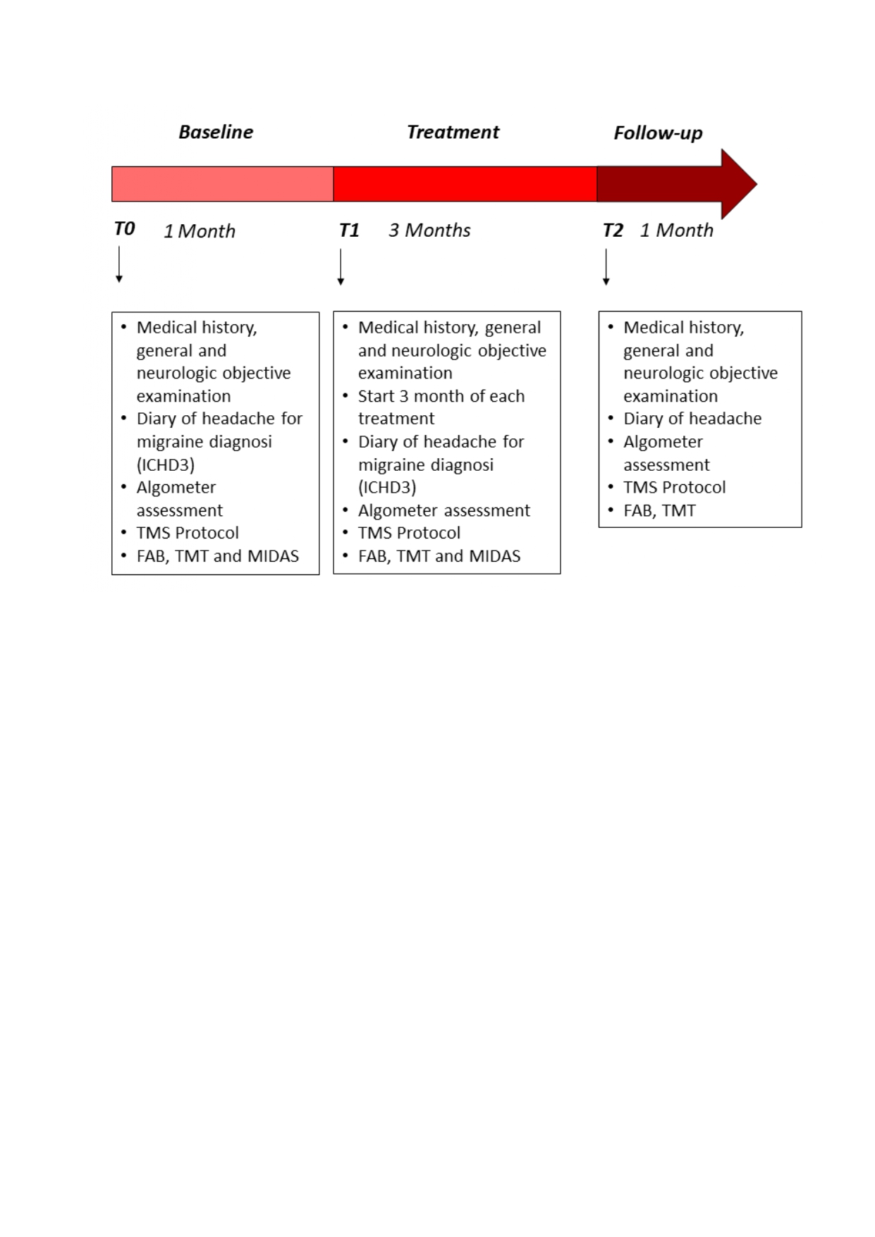 Some neurophysiological and clinical outcomes were collected: resting motor threshold (rMT), short intracortical inhibition (SICI) and facilitation (ICF), pressure pain threshold (PPT), trail making test (TMT), frontal assessment battery (FAB), headache-related disability (MIDAS) and headache parameters. Then, participants were randomized into three groups: active exercise only (n = 10), cognitive task only (n = 10) and dual task protocol (n = 10). After 3 months of each treatment and after 1-month follow-up the same neurophysiological and clinical outcomes were revaluated.