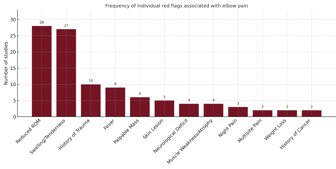 Reduced elbow range of motion and local swelling are the most consistently reported red flags across oncologic, infectious, orthopaedic, vascular, systemic and neurological conditions. Incorporating systematic screening for these indicators—alongside targeted history, blood-pressure measurement and a brief neurological check—can sharpen clinicians’ differential diagnosis and accelerate referral. Prospective studies are now needed to quantify the diagnostic accuracy of these red flags and refine evidence-based guidelines for elbow pain management.