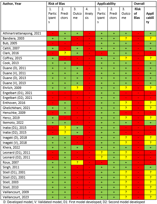 2. Wolff RF, Moons KGM, Riley RD, Whiting PF, Westwood M, Collins GS, Reitsma JB, Kleijnen J, Mallett S; PROBAST Group†. PROBAST: A Tool to Assess the Risk of Bias and Applicability of Prediction Model Studies. Ann Intern Med. 2019 Jan 1;170(1):51-58. doi: 10.7326/M18-1376. PMID: 30596875.