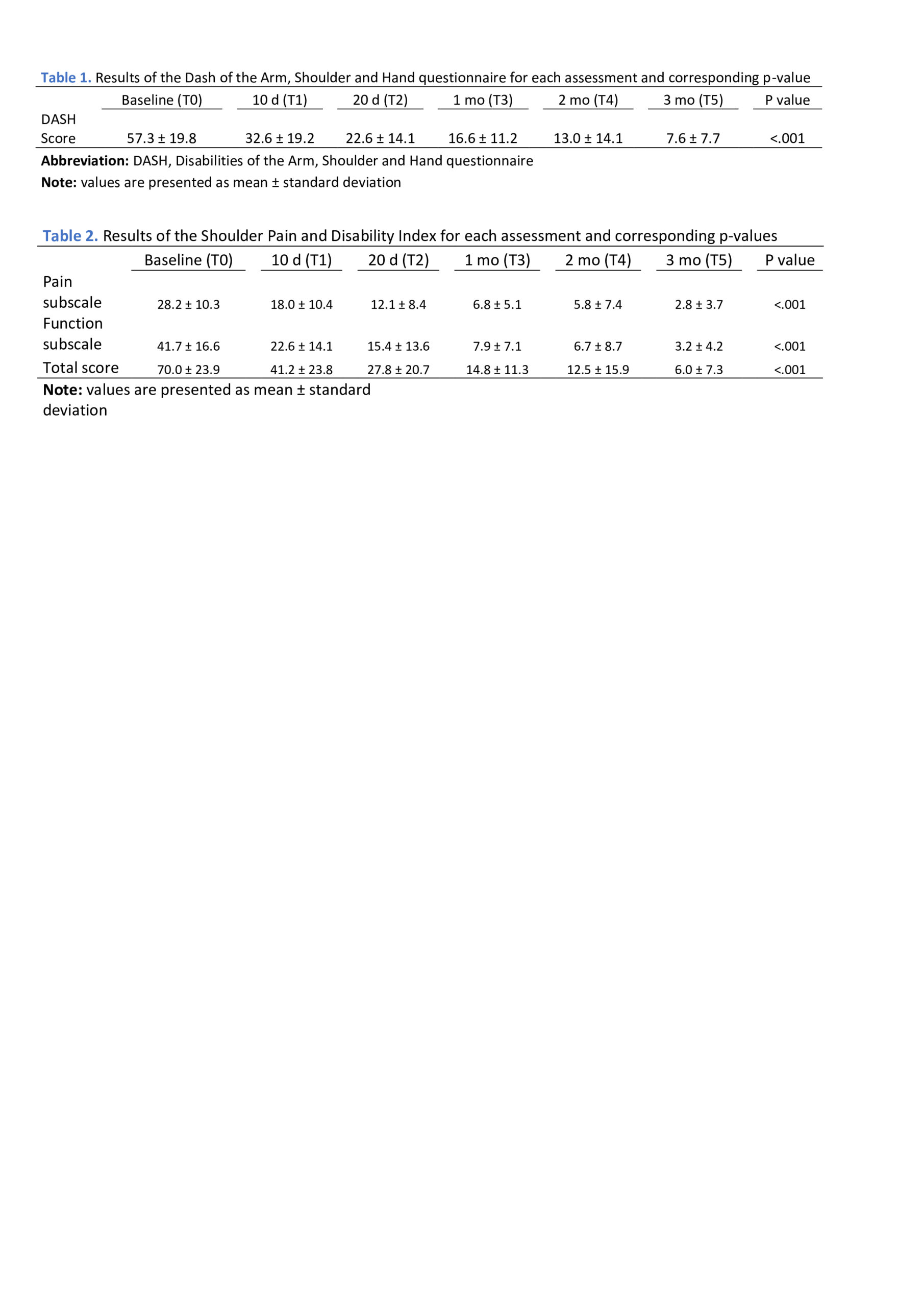 SPADI and DASH scores showed significant improvement from T1 (p = .000), maintained through T5 (Table 1-2). SF-36 subscales for Physical Functioning, Physical Role, and Emotional Role reached statistical significance at T3 (p = .007; .000; .034), T4 (.001; .000; .003), and T5 (.001; .000; .004). Bodily Pain and Social Functioning showed improvements from T2 (p = .003; .043) through T5 (.000; .000). Vitality and Mental Health were significant at T4 (.017; .007) and T5 (.000; .001) (Table 3). All average pROM scores improved significantly from T1 to T5, with clinically relevant gains in flexion, abduction, and external rotation at both 90° and 0° of abduction compared to T0 (Table 4).
